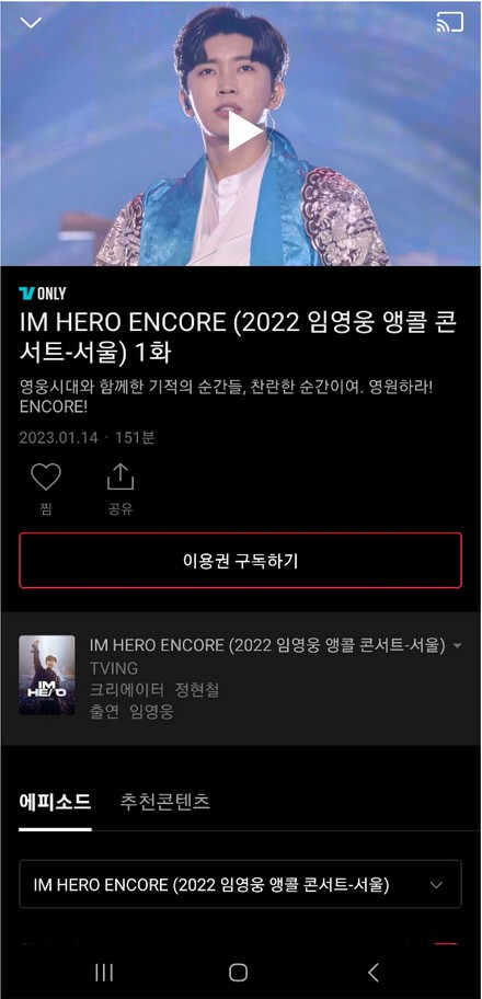 티빙에서 임영웅을 검색하여 다시 볼 수 있습니다. 앵콜 콘서트를 보고자 하시는 분들은 2번째꺼를 클릭하시면 됩니다. 티빙은 유료플랫폼으로 이용권을 구매 한 후 이용하실 수 있습니다. 아직도 이용권이 없으시다면 비싼가격 다 주지 마시고 꼭 저렴하게 이용하시길 바랍니다.